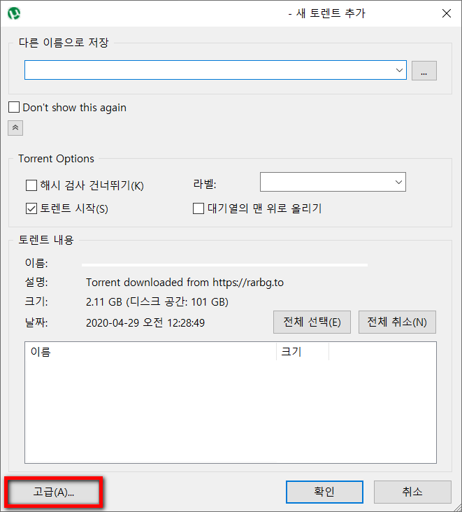 토렌트 추가 시 아래의 [고급]을 클릭합니다