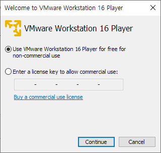 설치된 Workstation 16 Player를 실행하면 라이선스 입력창이 뜨는데 비상업용으로 사용한다고 체크하고 Continue를 누르면 됩니다