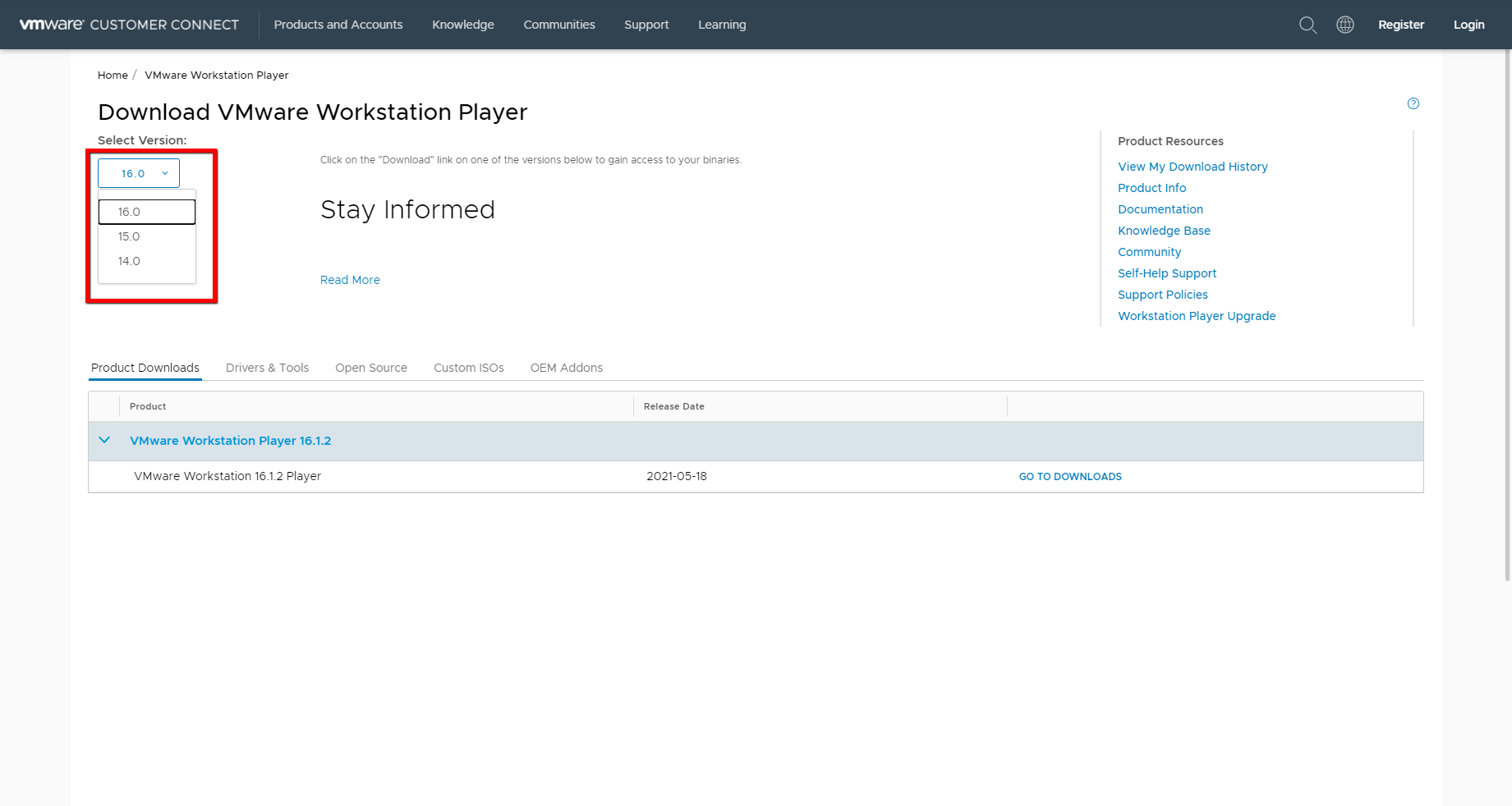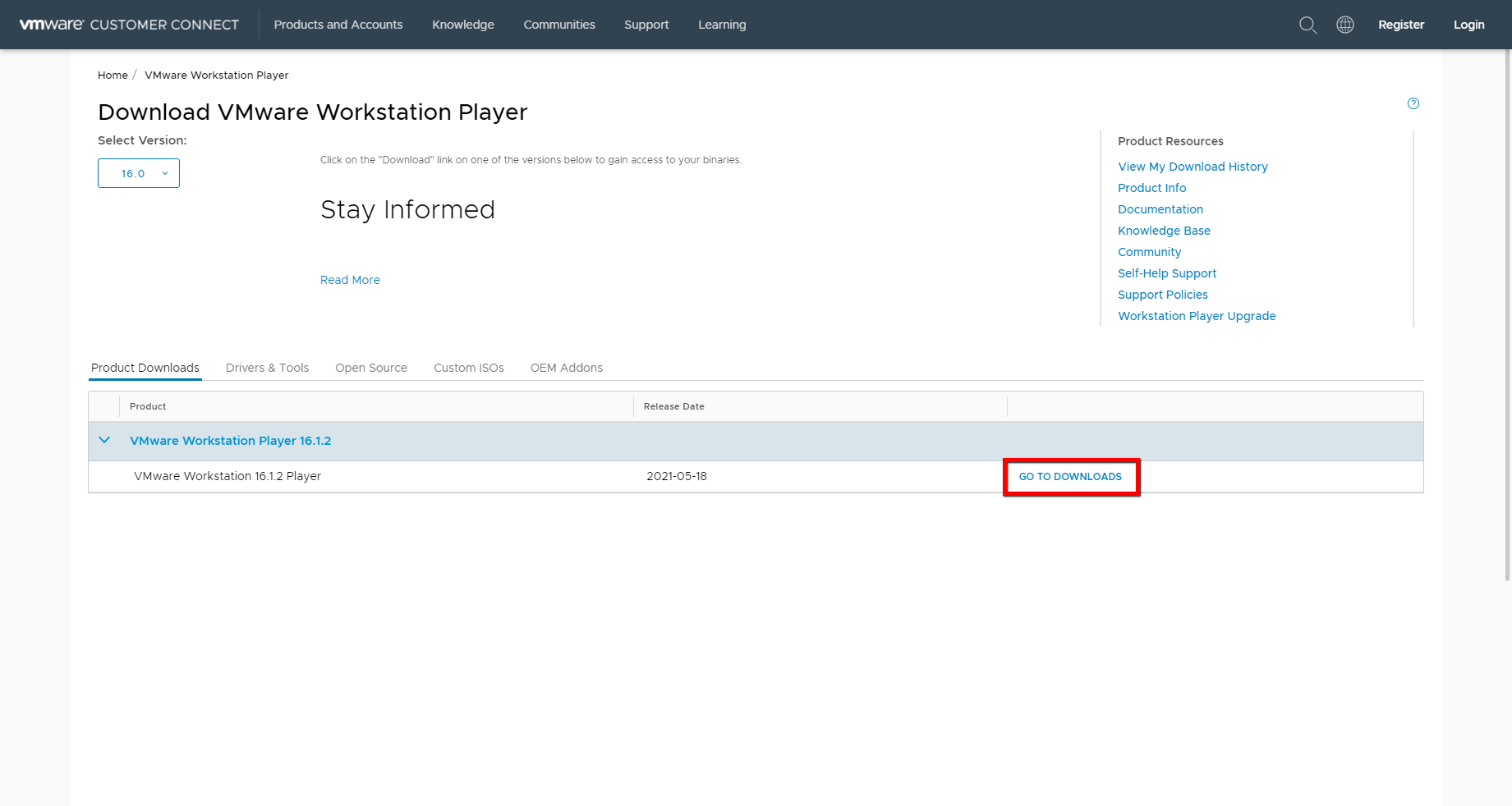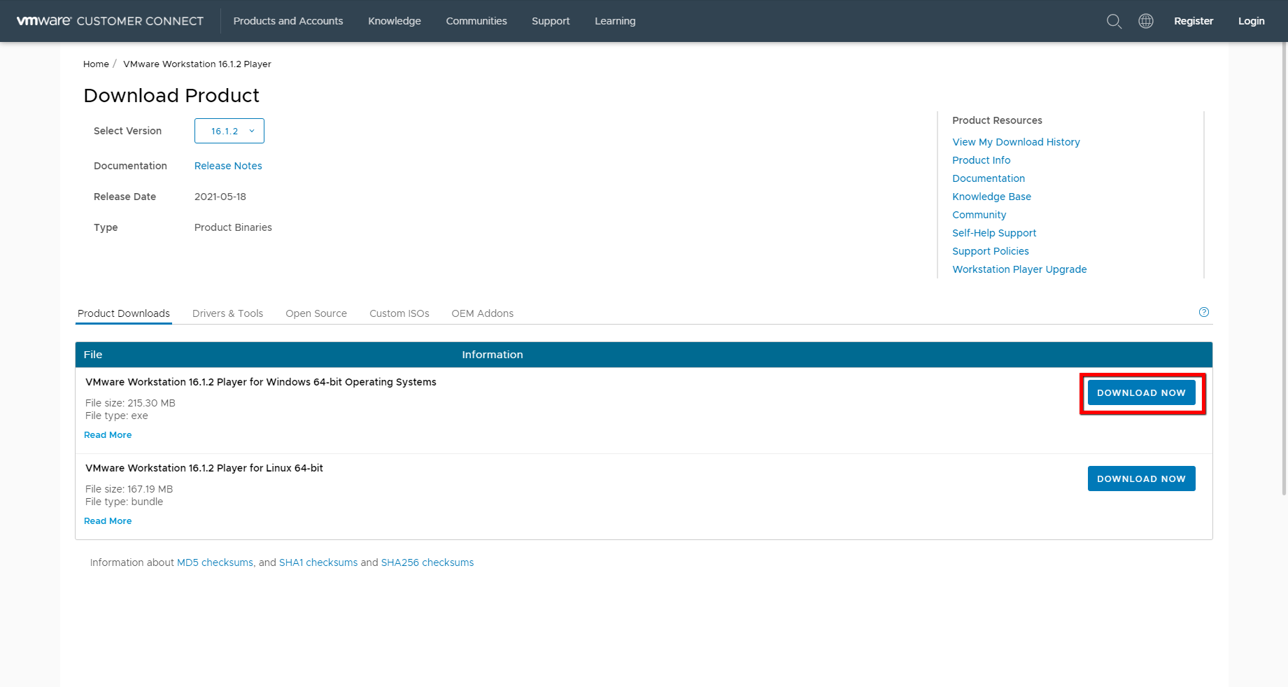 현재 기준 VMware Workstation Player의 최신버전은 16.1.2네요. Windows와 Linux 64bit 버전이 있습니다