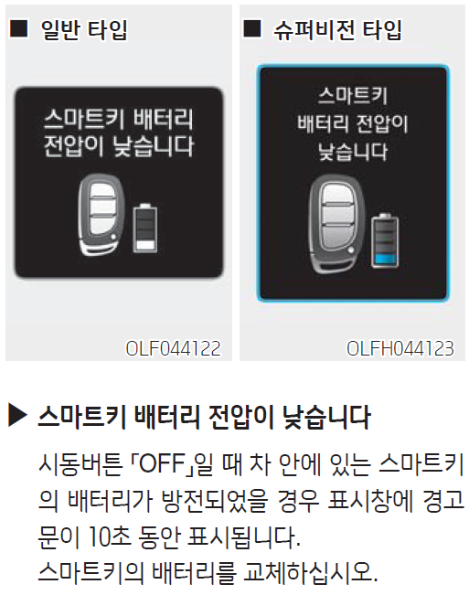 어느 날 시동을 끌 때마다 스마트키 배터리 전압이 낮습니다 라는 메시지가 뜨더라고요