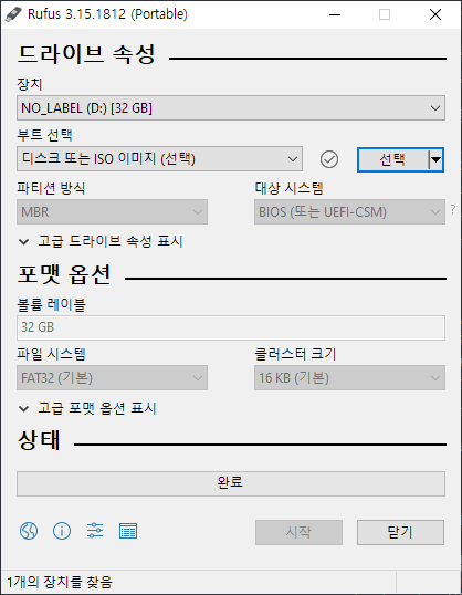 다음엔 아래와 같은 화면이 나올텐데 첫줄 장치 부분에 장착한 USB가 보이지 않는다면 확인해주시기 바랍니다