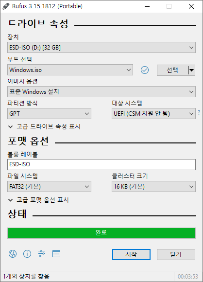 하지만 Rufus 툴을 이용하여 iso파일을 부팅USB로 만드는 방법을 아신다면