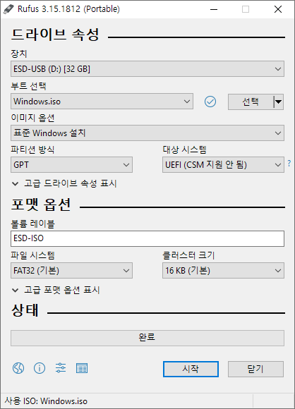 Rufus를 이용하여 Windows10 부팅 USB 만들기