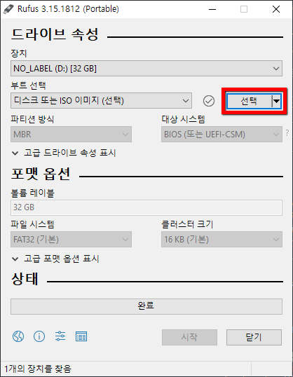 USB 메모리를 삽입한 상태에서 rufus를 실행시킵니다