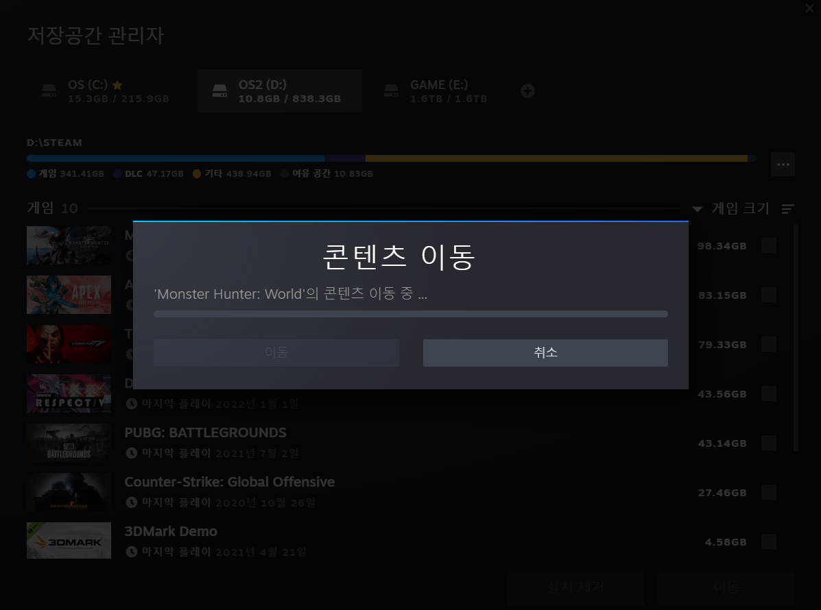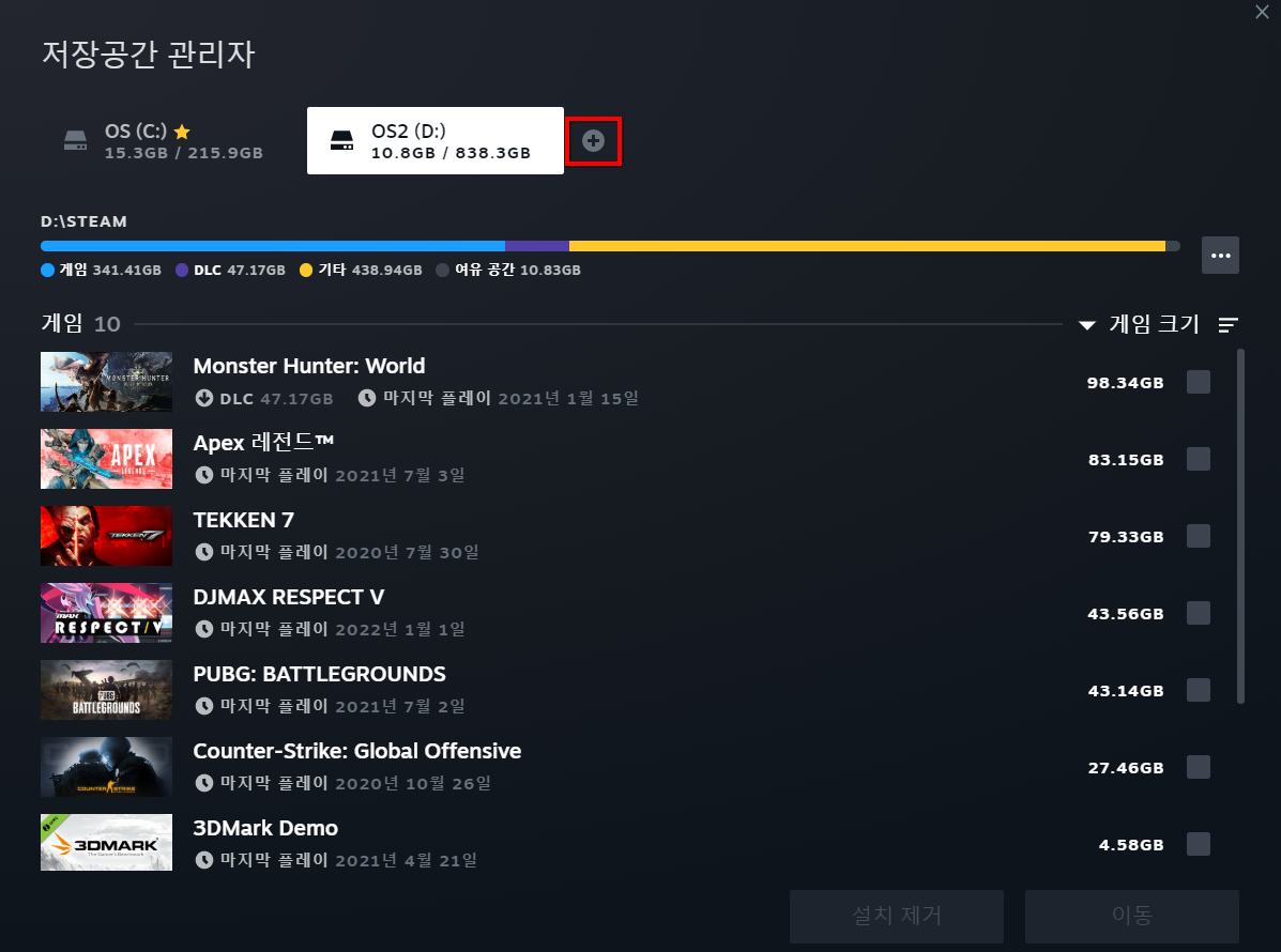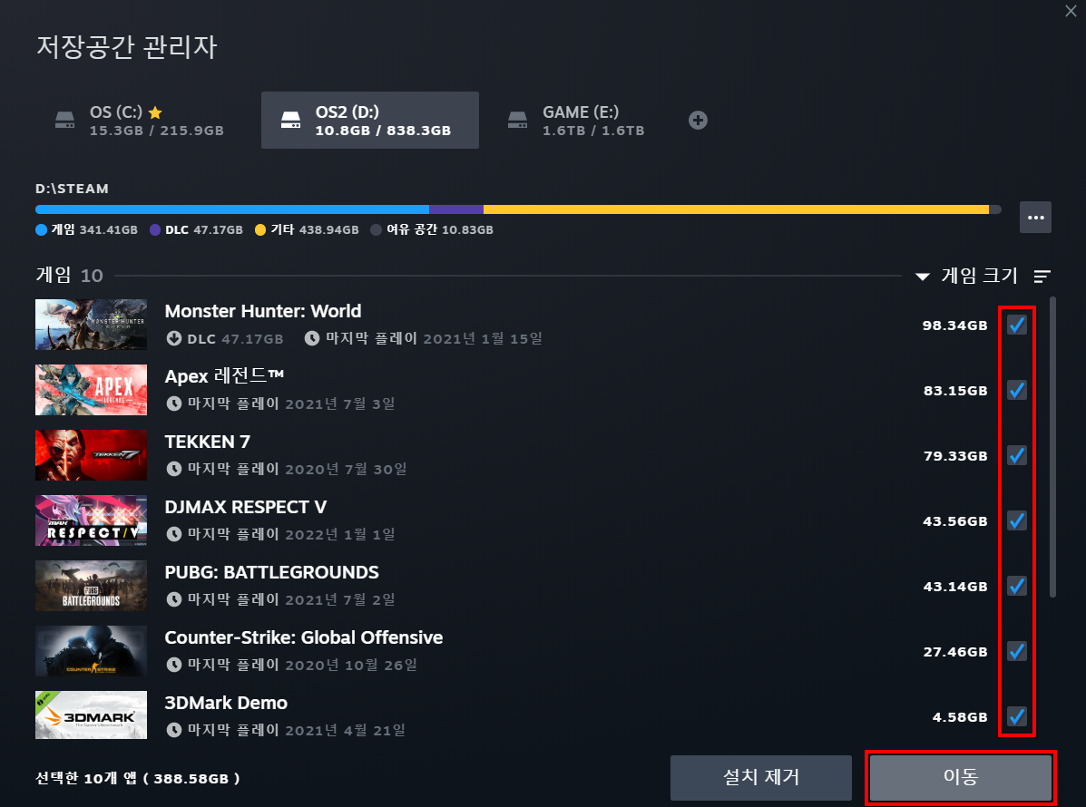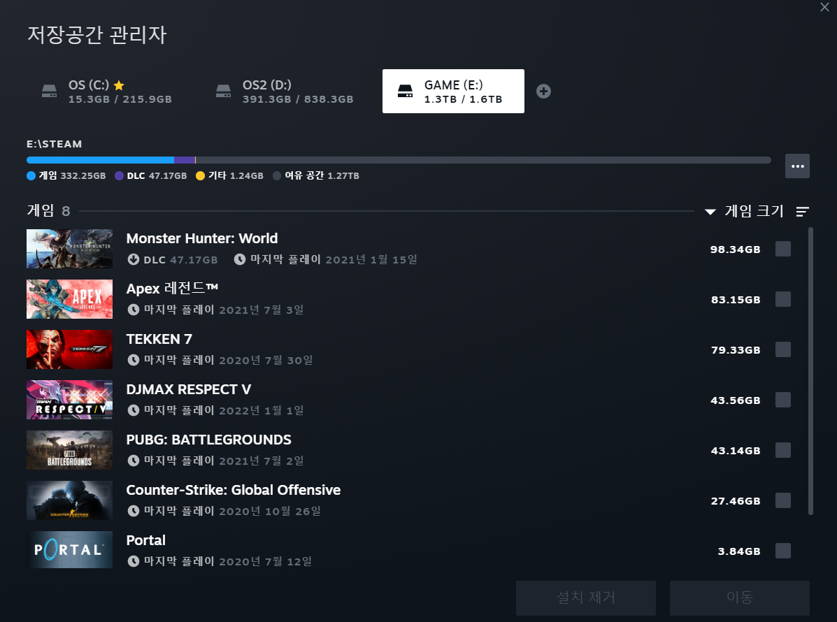 새 게임을 설치할때마다 기존 게임 지우기가 너무 귀찮다 보니 어느새 1TB가 가득 찼습니다