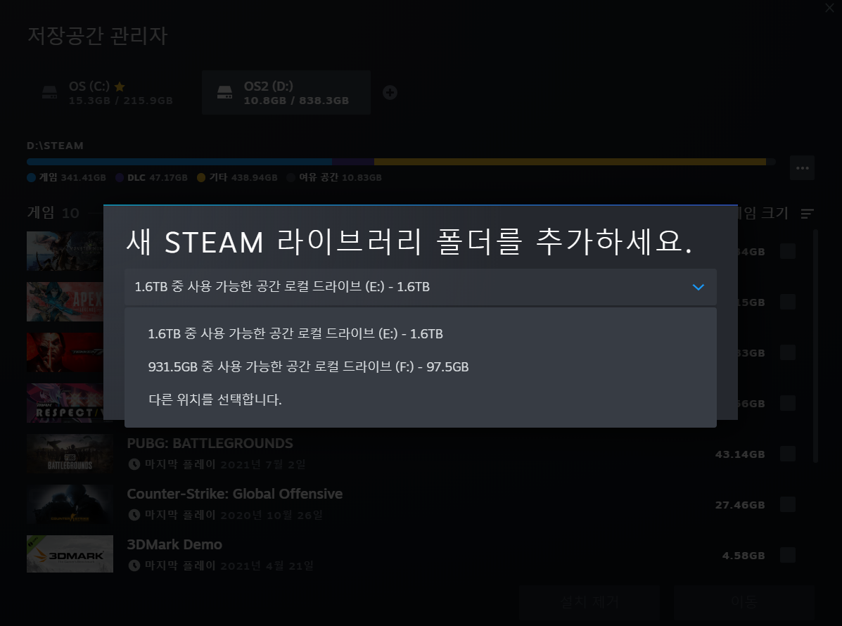 저는 [Steam]이라는 폴더에다 이동을 시킬 예정이기 때문에 [다른 위치를 선택합니다]를 선택했습니다