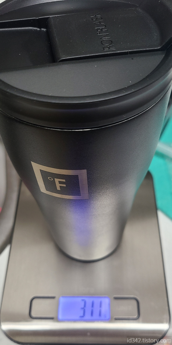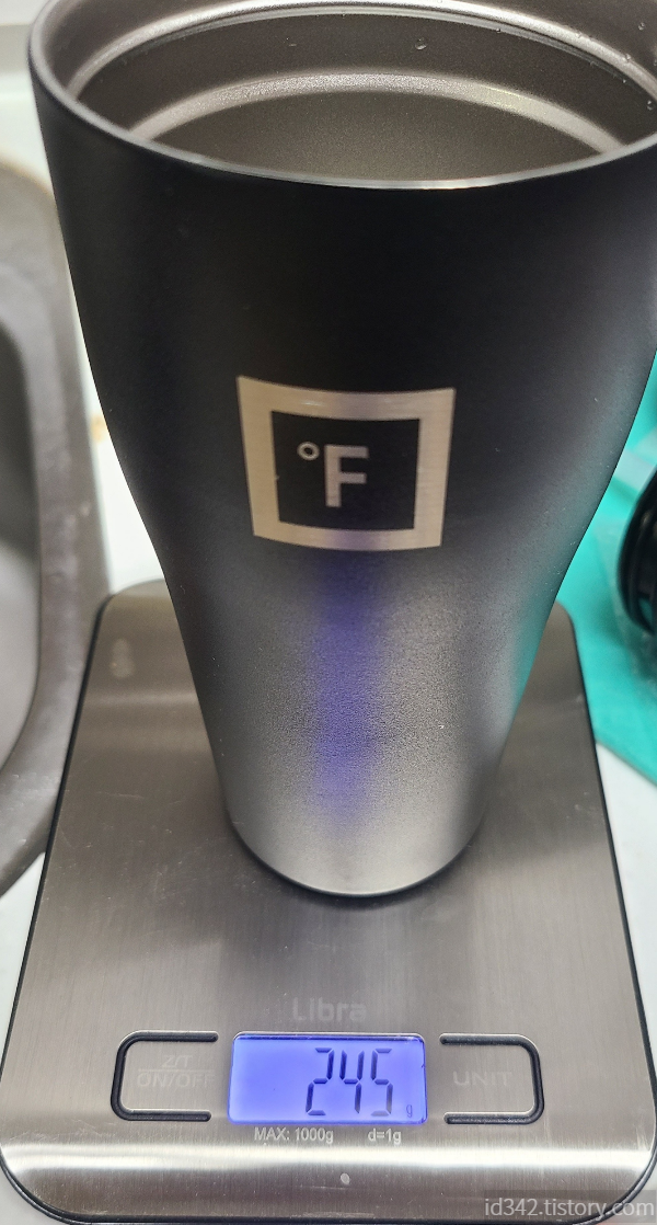 뚜껑 없이 텀블러 자체의 무게는 245g이며 플립 뚜껑, 빨대 뚜껑이 각각 311g, 319g이었습니다