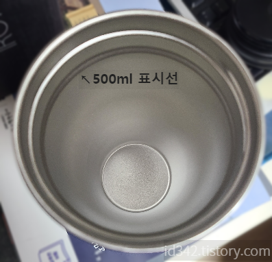 나사산 바로 아래쪽에 있는 500ml 표시줄까지 마신 다음에 뚜껑을 결합해야 넘치지 않습니다