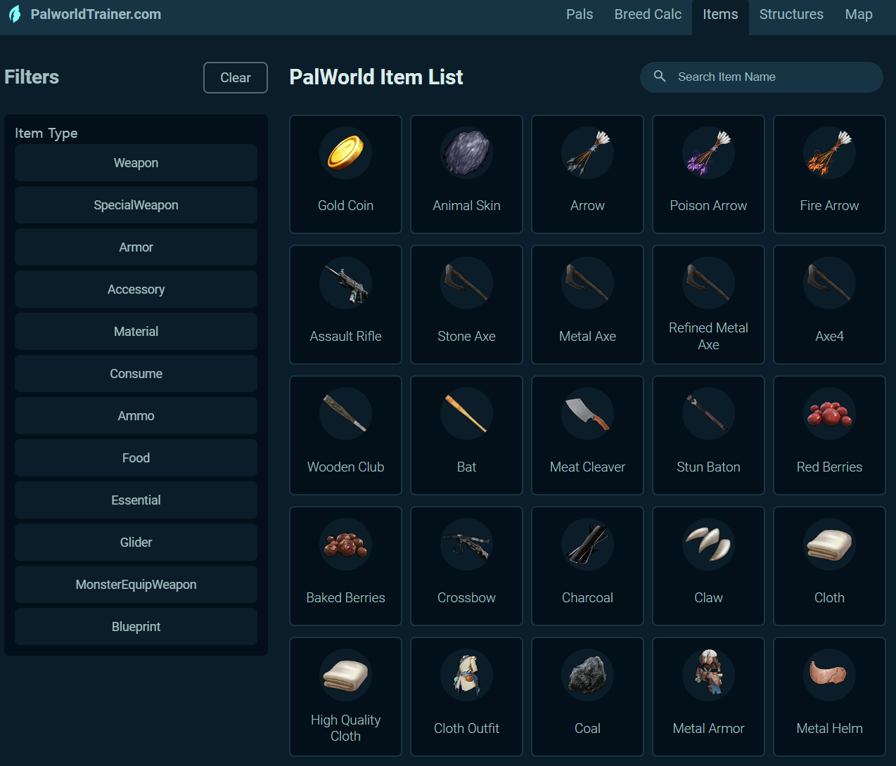 다음은 Palworldtrainer 입니다. 팰월드 트레이너는 아이템과 구조물, 교배식을 보기 쉽게 구현해 놓은 사이트입니다.