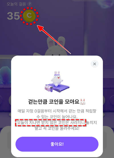만보기로 얻은 코인은 매일자정에 사라지니 꼭 코인을 눌러 수령을 해주세요