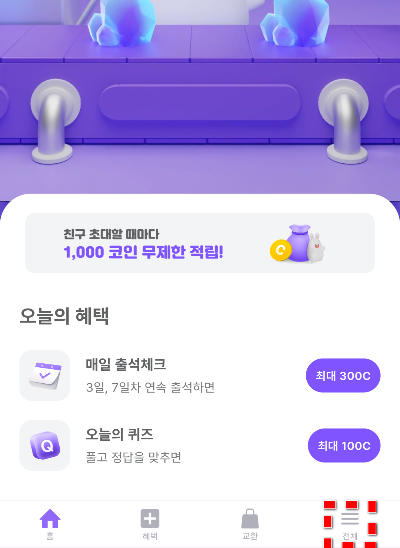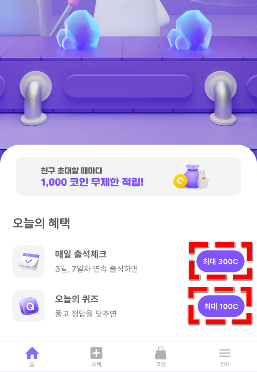 추가 코인을 모으기 위해 아래에 있는 [오늘의 혜택]에 출석체크와 오늘의 퀴즈를 풀어서 코인을 받습니다