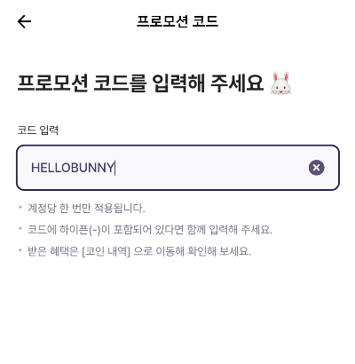 프로모션 코드에 HELLOBUNNY를 입력하시면 1000코인을 받을 수 있습니다