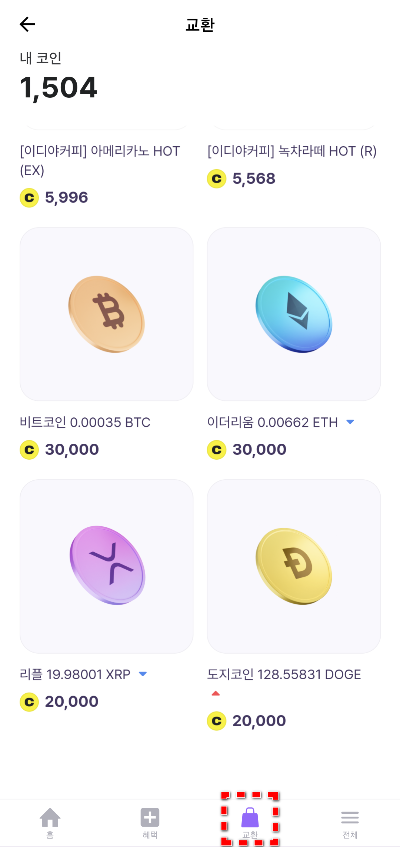 이렇게 모은 코인은 아래의 [교환]을 누르면 나오는 화면에서 비트코인이나 스타벅스, 이디야 커피, 도미노피자, 교촌치킨, 베스킨라빈스 교환권으로 할 수 있습니다